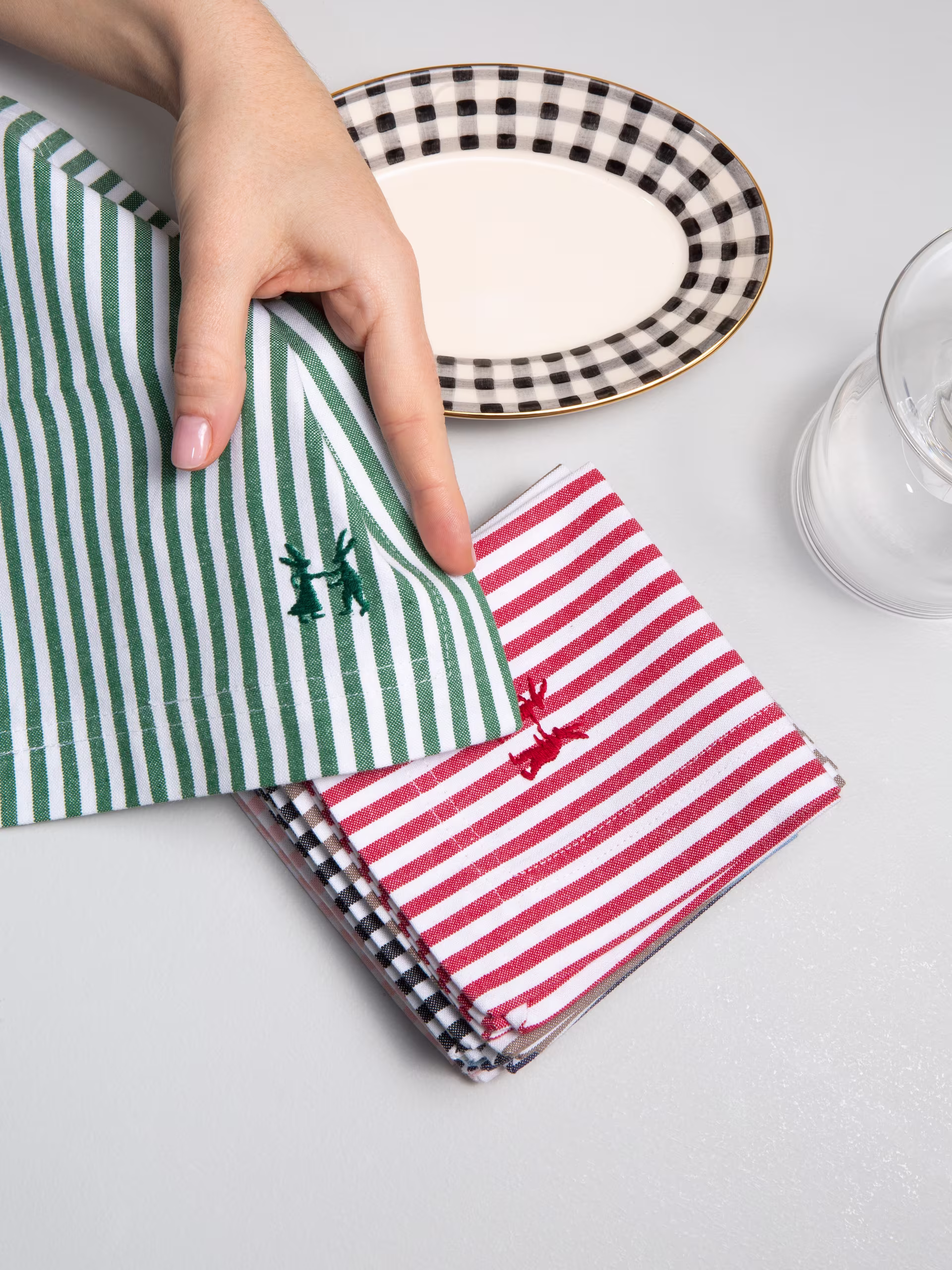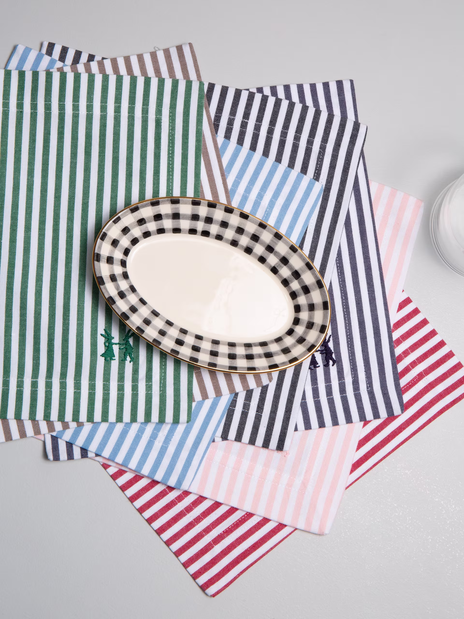The colourful cocktail nakins are a new addition to our range of table linen. Each napkin is made of soft cotton fabric, double-layered around the border and completed with a hand-embroidered dancing rabbits logo. Whether in combination with linen, striped or Vichy products, these small napkins will be a fun accessory for your next aperitif or cocktail party.