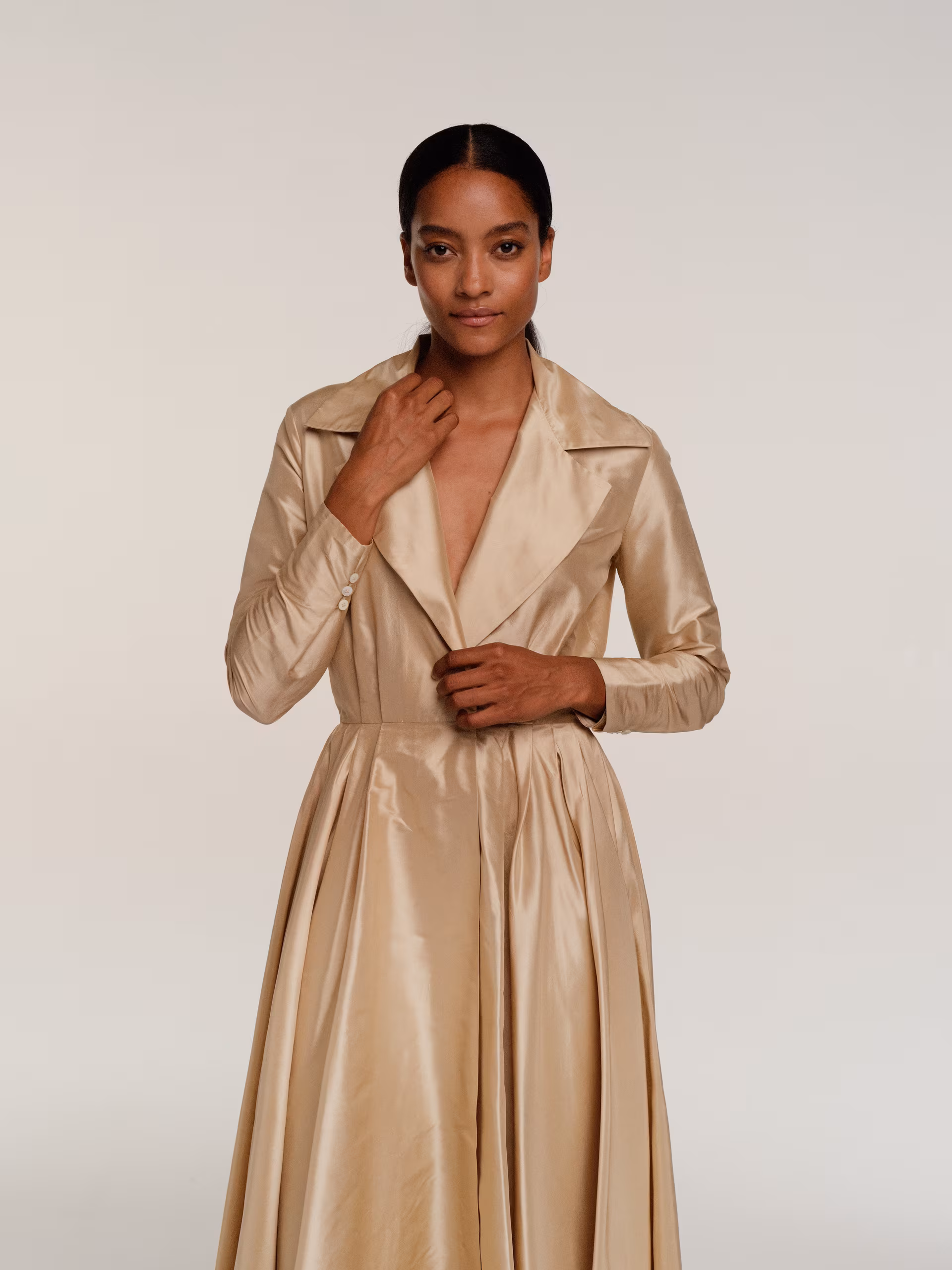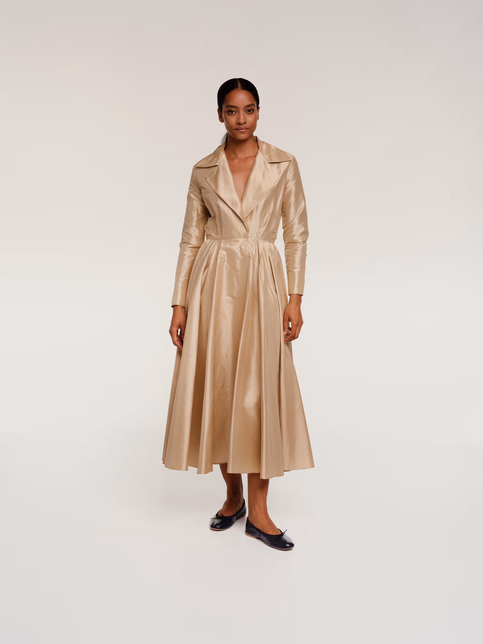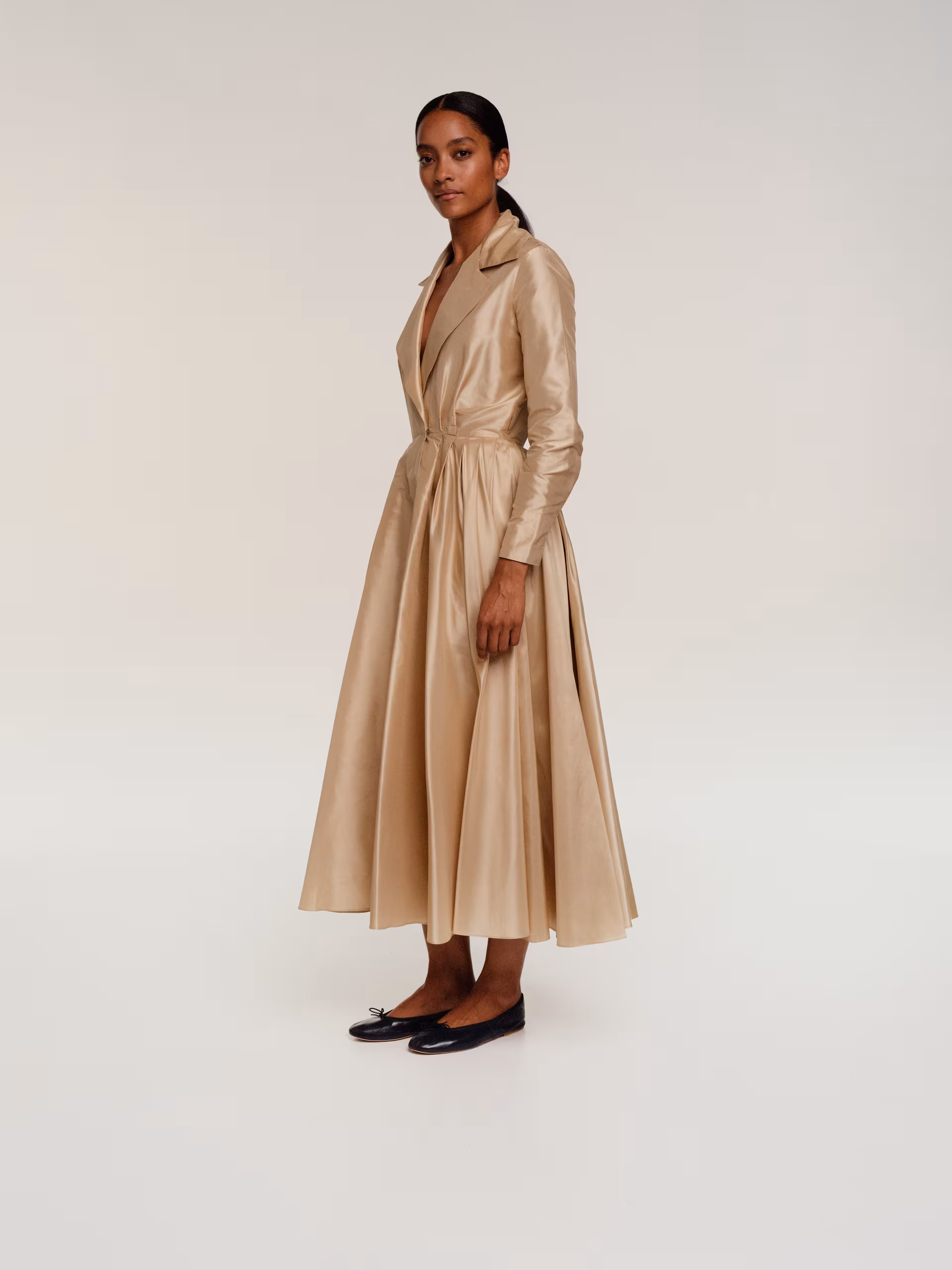 The Delphine dress in lustrous doupion silk is the perfect choice for all festive occasions.